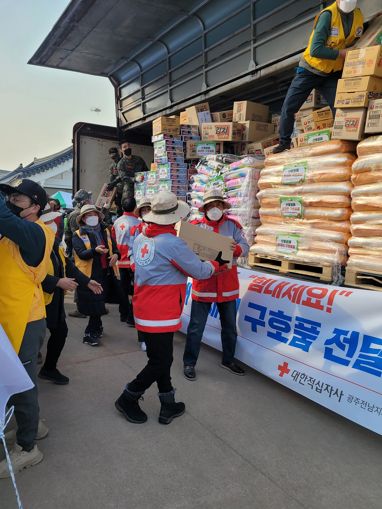 울진 가는 길은 멀었다. 광주에서 순천으로, 순천에서 울진까지 5시간이 꼬박 걸렸다. 먼저 도착 한 순천 팔마경기장 주차장에는 쌀, 즉석밥, 라면, 생수 등이 쌓여 있었다.