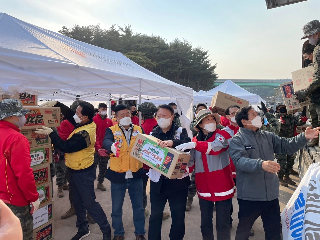 순천시는 나눔의 한 방식으로 코로나 19 발생 내내 취약계층을 돕기 위해 권분 운동(조선시대 부자들이 가난한 사람에게 곡식을 내어주도록 하던 일)을 하고 있다. “ 이 운동이 범국가적인 이재민 돕기 기부운동으로 확산돼 산불 피해로 어려움을 겪는 이재민들이 희망을 가질 수 있었으면 좋겠다.”라는 허 석 순천시장님의 바람을 안고 울진으로 향했다. 우리 앞에 소방차를 에스코트 삼아 부지런히 뒤따라 갔다. 울진에 다다르자 나무 타는 냄새가 코를 찌르고 멀리서 산 위에 피어오른 연기가 보였다. 하늘 위는 부지런히 소방헬기가 물을 나르고 있었다.