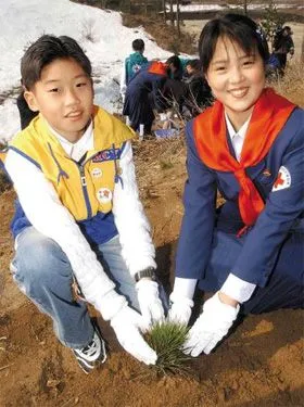 2003년 박용희군과 리설주가 금강산에서 식목하는 모습