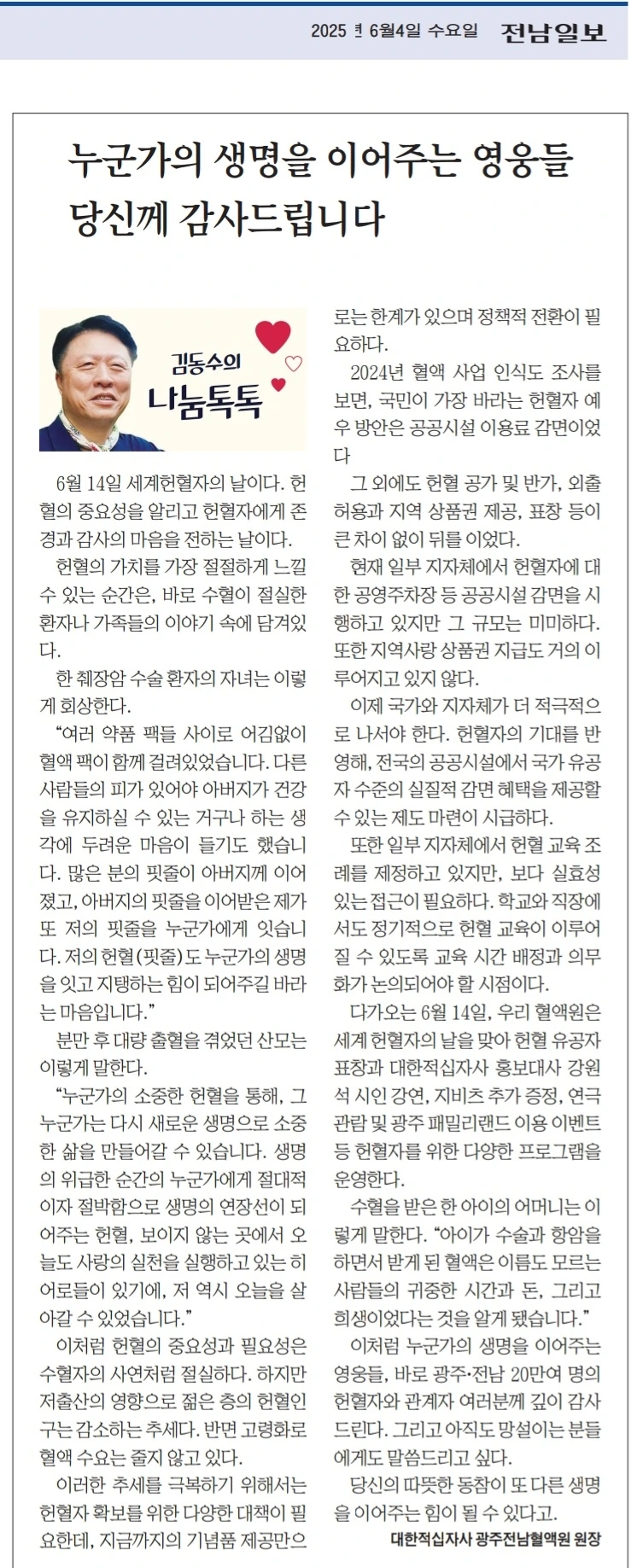 이처럼 누군가의 생명을 이어주는 영웅들, 당신께 감사드린다. 그리고 아직도 망설이는 분들에게도 말씀드리고 싶다.