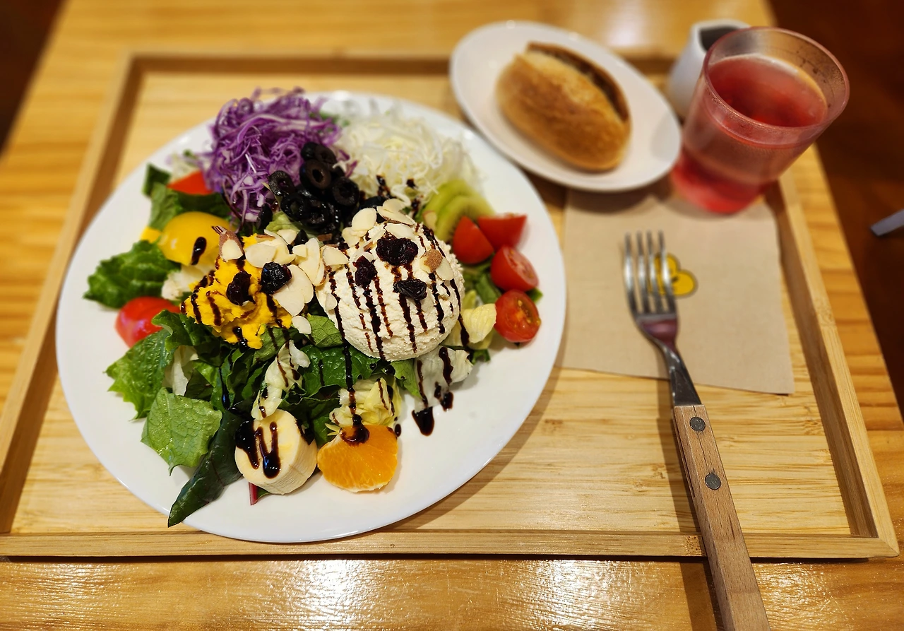 행복한 소리에 귀를 기울이고 있다 정신을 차려 보니 샐러드가 눈앞에 있었다. 각종 채소들, 바나나와 귤, 올리브, 키위, 좋아하는 단호박 샐러드와 리코타 치즈. 생각보다도 더 많은 양이 나와서 다 먹을 수 있을까, 하고 걱정이 될 정도였다. 노릇하게 구워져 보기만 해도 바삭해 보이는 작은 빵과, 붉은색을 띠고 있는 이름 모를 따뜻한 차 한 잔.
