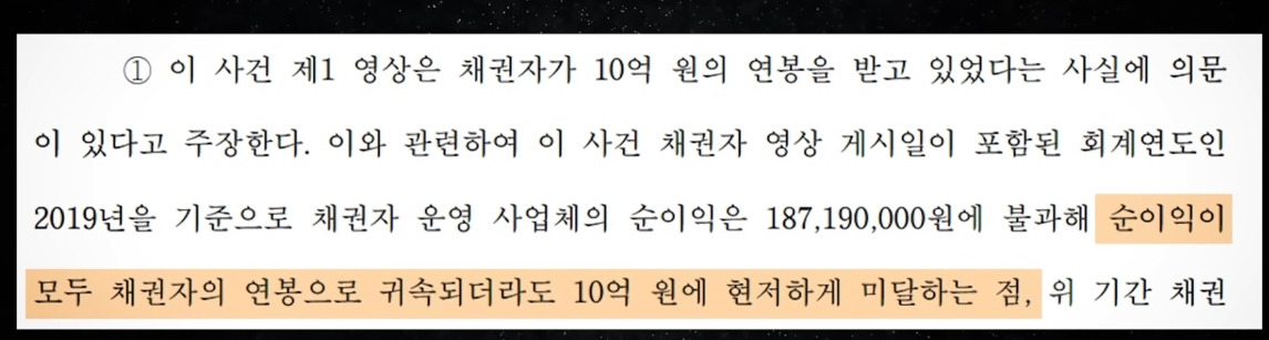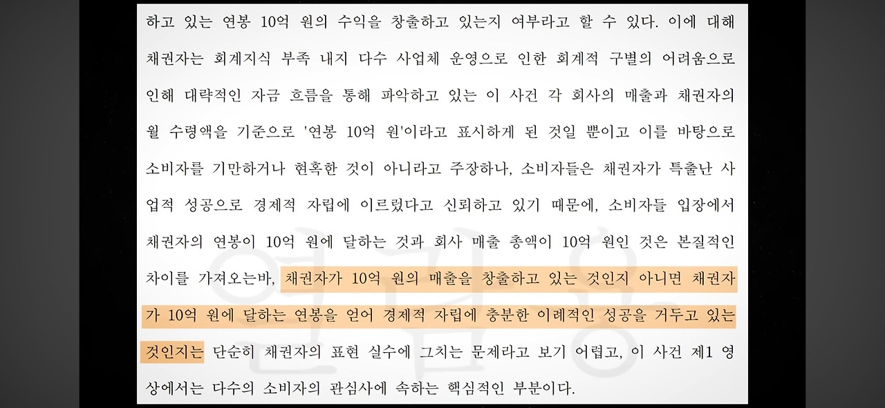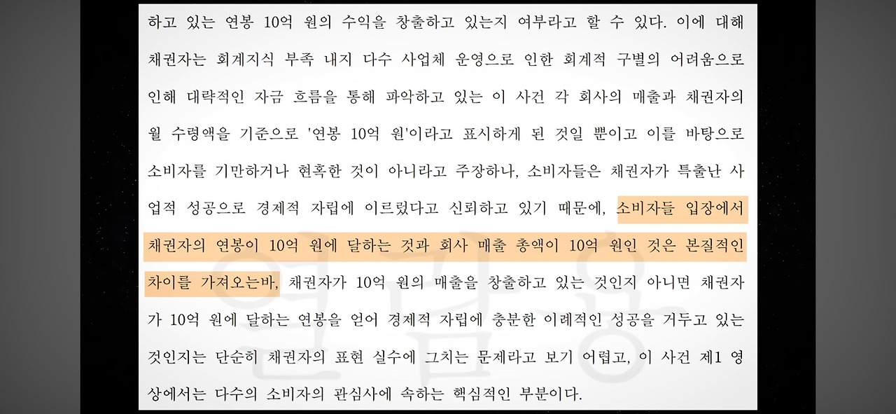 본인 개인의 연봉이 10억은커녕, 2019년 기준 해당 '사업체'의 순이익이 1억 9천만 원밖에 되지 않았다. 그 후로도 순이익이 10억이 된 적은 한 번도 없었다. 물론 회사의 '매출총액'이 10억 원에 도달한 적은 있다고 한다. 이 10억 원에서 원가, 인건비, 임대료, 홍보비, 제세금 등 뗄 거 다 떼야 그 사람의 주머니에 떨어지는 돈이다. 본인이 '연봉 10억'을 찍었다는 것은 말장난일 뿐이다. 말이 좋아 말장난이지, 사실 사기에 가깝다.