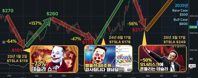 구독자가 360만 명에 달하는 대중적인 경제 유튜브 채널인 '슈카월드'에 테슬라를 조롱하는 영상이 올라오고, 대부분의 해당 채널 구독자들도 댓글로 함께 조롱할 때가 바로 '저점'이라는 밈이다. 해학의 민족인 대한민국인 만큼, 투자자들 사이에서 웃자고 하는 소리를 너무 진지하게 받아들일 필요는 없지만, 생각보다 꽤 의미 있는 통찰일 수도 있다고 생각한다. 어디까지나 ‘믿거나 말거나’의 영역이다.