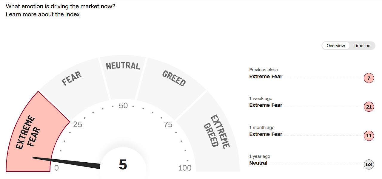 트럼프가 관세로 칼춤을 추며, 미국을 포함한 전 세계가 경기침체에 접어들 것이라는 공포와 우려로 2025년 4월 4일 금요일 밤, CNN의 공포&탐욕 지수는 5를 기록했다. 가히 역사적인 순간이었다.