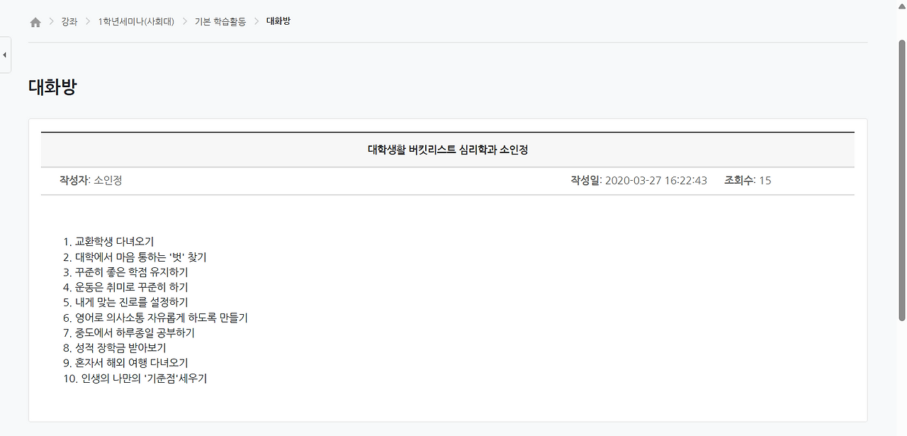 버킷리스트라는 단어와 낯을 가리게 된 지 벌써 몇 년이 흘렀다. 기억하는 가장 최근의 버킷리스트 작성은 대학교 1학년 세미나 수업 과제였던 ‘대학 생활 버킷리스트’다. 이미 대학을 졸업해 1년이 넘게 지난 이 시점에서, 새내기 낭만이 가득 찼던 리스트와 실제 현실은 어느 정도 격차가 있는지 확인해 보기로 결심했다.