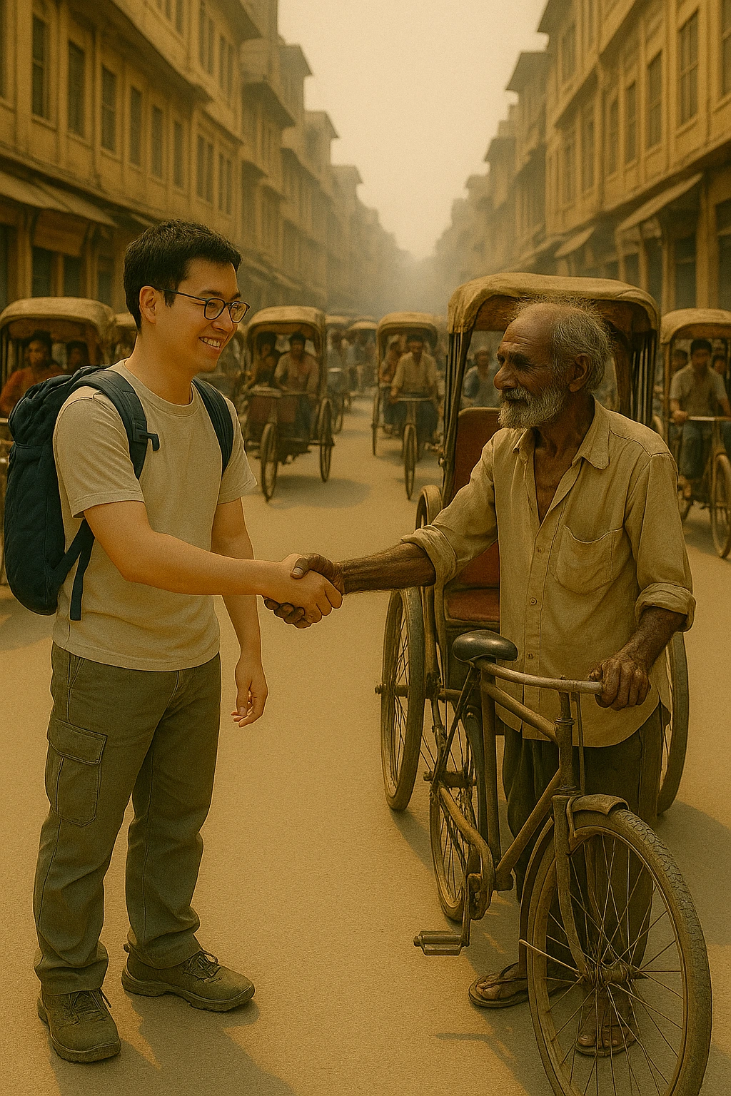 상대를 제대로 존중하는 것은 보이는 외형상의 편견과 선입견에서 벗어나 있는 그대로를 받아들이고 인정해 주는 마음이 아닐까. 도착지에 내린 후 릭샤값에 팁을 지불한 후 아저씨와 악수하고 그가 돌아섰다. 서너 걸음 가던 그가 갑자기 몸을 틀어 릭샤 아저씨에게 다시 왔다. 뭘 감지한 듯 불쑥 그의 카메라가 아저씨의 손바닥을 비췄다. 그가 말했다. I respect you (나는 당신을 존경한다).