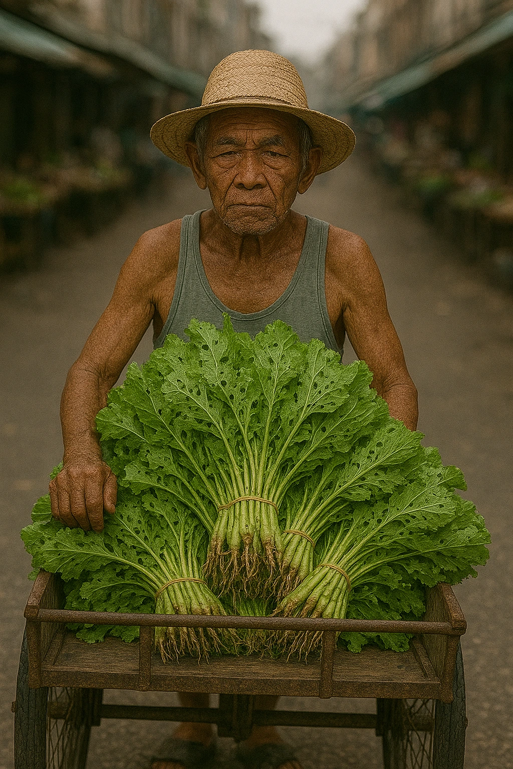 멀리서 보이는 연록의 유순함에 이끌린 나는 열무 더미 가까이 다가가 들여다보았다. 옆에 잠자코 서 계신 농부 할아버지는 땀에 찌들어 빛이 바래고 목이 늘어난 난닝구를 입고 있었다. 황토색으로 그을린 얼굴을 밀짚모자로 반쯤 가린 채 손님이 오거나 말거나 우두커니 그냥 서 있을 뿐이었다.