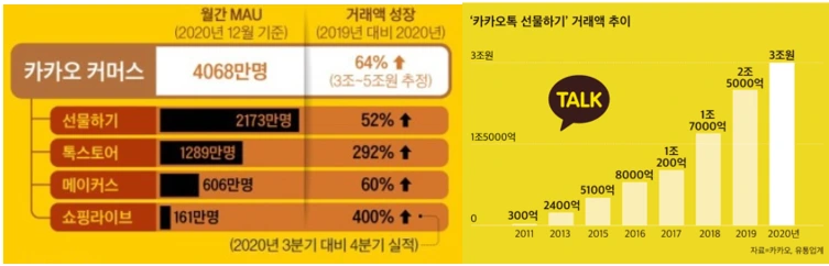 카카오는 월 사용자 4천만 명 이상 의 “카카오톡”을 통해 국내 소비계층의 대부분을 고객으로 확보합니다. 카카오 커머스의 핵심 서비스는 ‘선물하기’와 ‘톡스토어’입니다.