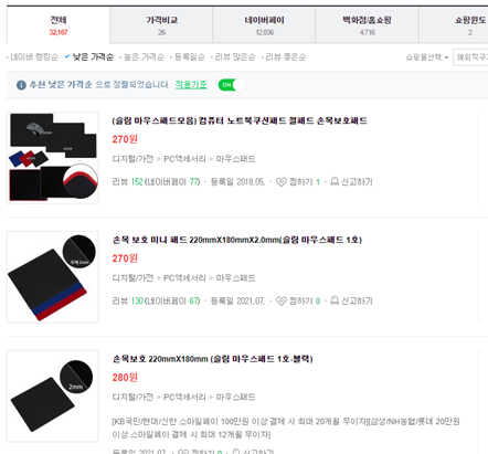첫 번째 사례는 마우스패드를 판매하는 어느 쇼핑몰의 사례입니다. 보통 마우스패드의 가격은 저렴한 것은 2~3천 원 정도, 비싼 것은 1~2만 원을 넘어가기도 합니다. 네이버에서 “손목보호마우스패드”라고 검색해 보겠습니다. 낮은 가격순으로 정렬하니 최저가 270원이 보입니다. (심지어 어떤 때는 0원에 판매하는 경우도 있습니다.)