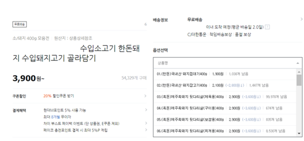 먼저 가격을 살펴보겠습니다. 돼지껍데기 400g 1,900원, 제주 흑돼지 뒷다리살 400g 2,900원입니다. 무려 “무료배송” 상품입니다. 냉장/냉동 택배비는 일반 택배보다 비싼 3,000~4,000원입니다. 아무리 택배비를 싸게 해도 이익이 날 것 같지 않습니다. 일반 판매자는 도저히 엄두 내지 못할 가격으로 판매하기 때문일까요? 무려 5만 개 이상의 구매가 쌓였습니다. 단순 계산으로도 억대 매출로 보이네요. 도대체 비결이 무엇이었을까요?