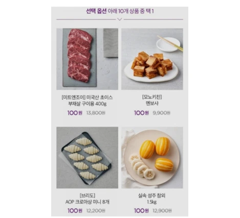 컬리(Market Kurly)도 체리피킹을 잘 이용하는 판매자 중 하나입니다. 컬리에는 정육, 과일, 간편식 등 카테고리에 관계없이 100원에 구매할 수 있는 프로모션 상품이 항시 운영 중입니다. 물론 조건이 붙기는 합니다. “신규회원 가입조건”, “10,000원” 이상 구매 시 사용 등 말입니다. 그래도 컬리 입장에서는 회원을 모을 수 있는 가장 강력한 방법이며, 컬리의 재구매율이 70%를 상회하기 때문에(관련 자료: 마켓컬리, 재구매율 71.3%의 비결은? 2021.12.23중앙일보), 100원 프로모션은 성공적으로 마케팅 방법으로 지속 사용되고 있습니다.