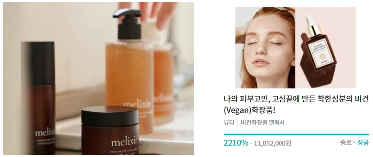 2. 비건 코스메틱 브랜드 멜릭서(melixir)는 18년 8월 크라우드 펀딩 와디즈를 통해 론칭했습니다.