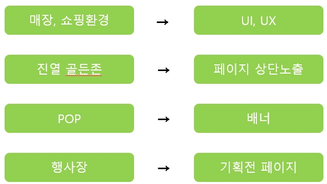 진열 골든존은 페이지 상단 노출로, POP는 배너로, 기획전 매대는 기획전 페이지로 바뀌었을 뿐 쇼핑 메커니즘은 비슷하더군요.