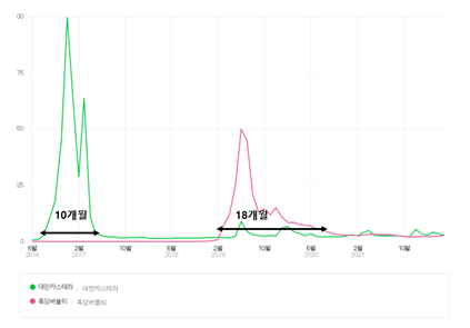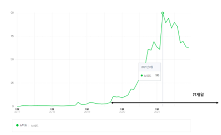 한 때 유행이었던 ‘흑당버블티, 벌집아이스크림, 대만카스테라’의 인기 기간이 1년에서 길게는 2년 정도였습니다. 전형적인 Fad사례입니다. ‘노티드(knotted)’는 20년부터 본격적으로 입소문이 나게 되어, 21년 8월에 언급량 정점을 찍었습니다. (네이버 데이터랩 기준). 2년가량 인기가 지속된 시점입니다. 올해가 지났을 때 바이럴량이 반등할 것인지, 하락할 것인지에 따라 해당 브랜드의 지속가능성에 대한 가늠을 해볼 수 있을 것 같습니다.