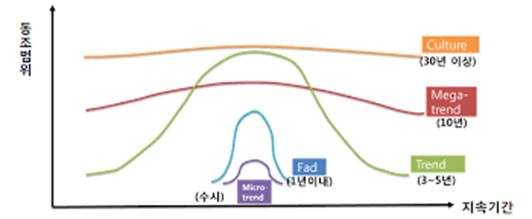 일시적 유행을 영어로는 Craze 또는 Fad라 합니다. 우리가 일상적으로 사용하는 트렌드(Trend)는 3~5년 지속되었을 때 트렌드(유행)이다라고 할 수 있으며, 트렌드가 10년 정도 지속되면 메가 트렌드, 한 세대(30년 이상) 지속되었을 때 비로소 ‘문화(Culture)’레벨로 올라서게 됩니다. 여담으로, ‘서태지’가 데뷔 30년이 지난 지금의 시점에도 영향력을 인정받는 걸 보면 “문화”대통령이란 표현이 적절했던 것 같습니다.
