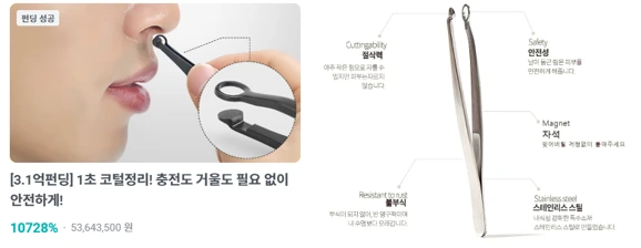 아래의 제품은 제가 대형마트 근무할 때 상담한 적이 있는데, 여러 이유로 입점되지 못했습니다. 가격도 기존 제품 대비 비싼 것은 둘째 치고, 미용소품 매대에서는 코털정리기가 철저한 One Of Them. 즉, 너무나 작고 미미한 매출 비중으로 인해 넓은 진열공간의 할당이 어렵고, 오직 통일된 소품 패키지에 구색으로만 의미가 있던 것이었습니다. 몇 년뒤 한 크라우드 펀딩 사이트에 출시된 해당 제품은 누적 3.1억 매출로 펀딩 종료되었습니다.
