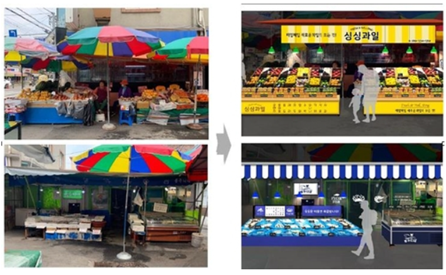 통상 바닥에 가까이 낮게 설치돼 있는 평평한 판매대를 소비자 눈높이에 맞게 끌어올리면 구매자 골든존(눈높이 하방 15~20%)에 상품이 위치하게 되어 보기에도 편하고 위생 수준도 개선이 됩니다. 오래 앉아있는 상인들을 위한 높이감이 있는 의자도 필요하겠습니다.
