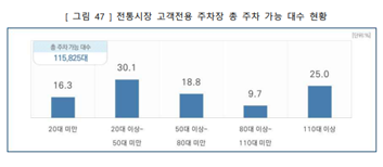 코스트코와 같은 대형마트가 확보하고 있는 주차면수는 최소 수백 대~천여 대 이상입니다. 반면 전국 전통시장 중 110대 이상의 주차면수를 확보한 곳은 25% 수준에 불과합니다. 쇼핑한 물건을 직접 들고 가야 할 상황이 많습니다. 때문에 비축형 대량 쇼핑보다는 즉시 소비성 쇼핑. 가족단위 체류형 쇼핑이 아닌 개별단위의 목적성 쇼핑. 일부러 찾아가 보는 광역단위 방문이 아닌 지역의 근린, 동네 상권으로 판단됩니다. 주차 시설이나 편의시설 확충에는 돈과 물리적 공간이 필요하기 때문에 당장 개선하기 어렵습니다.