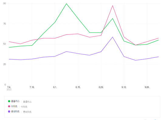 지난 6월 등장한 홈플러스 반값 치킨(당당치킨)이 판매 4개월 만에 100만 개가 팔렸습니다. 이후 등장한 반값 시리즈(피자, 탕수육 등)는 치킨만큼의 파급력을 보여주지 못했습니다만, 그럼에도 행사를 통해 대형마트가 수확한 것은 상당합니다. 언론과 소셜미디어에 수천수만 건 언급이 되어, 매장 방문객 증가에 기여했습니다. 또한 프랜차이즈 치킨업체와 비교되며 고물가 시대에 가격안정 채널로서의 선택지로 자리매김하는 효과도 얻었습니다.