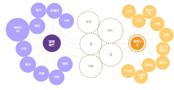아래는 최근 1년간 인스타, 블로그, 트위터 등의 소셜미디어에서 언급된 대형마트와 전통시장의 연관어를 분석한 내용입니다.