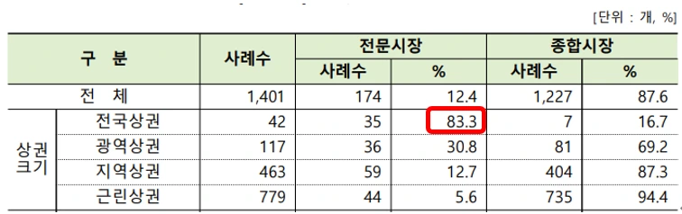 ※ 전문시장은 수산, 청과, 한약재 등의 유사 업종이 주를 이루는 시장이며, 종합시장은 다양한 업종으로 구성된 시장을 말함.