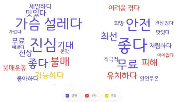 아래는 대형마트 3사와 전통시장의 긍정/부정 키워드를 비교 분석한 표입니다.
