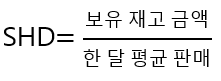 즉, 현 보유재고(+발주중인 재고)를 월 평균 판매(또는 출고)금액으로 나눈 것입니다. 예를 들어, 현재 10억 재고가 있고, 월 1억 재고가 판매된다면 SHD는 10개월≒약 300일이 됩니다.