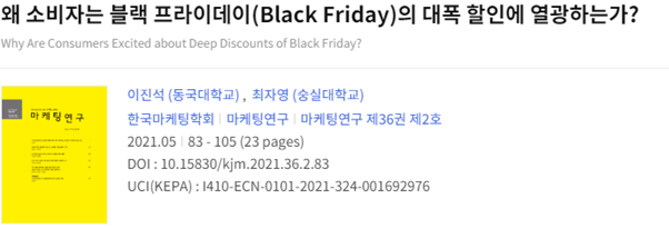 [출처: 왜 소비자는 블랙 프라이데이(Black Friday)의 대폭 할인에 열광하는가? Why Are Consumers Excited about Deep Discounts of Black Friday? 저자: 이진석/최자영]
