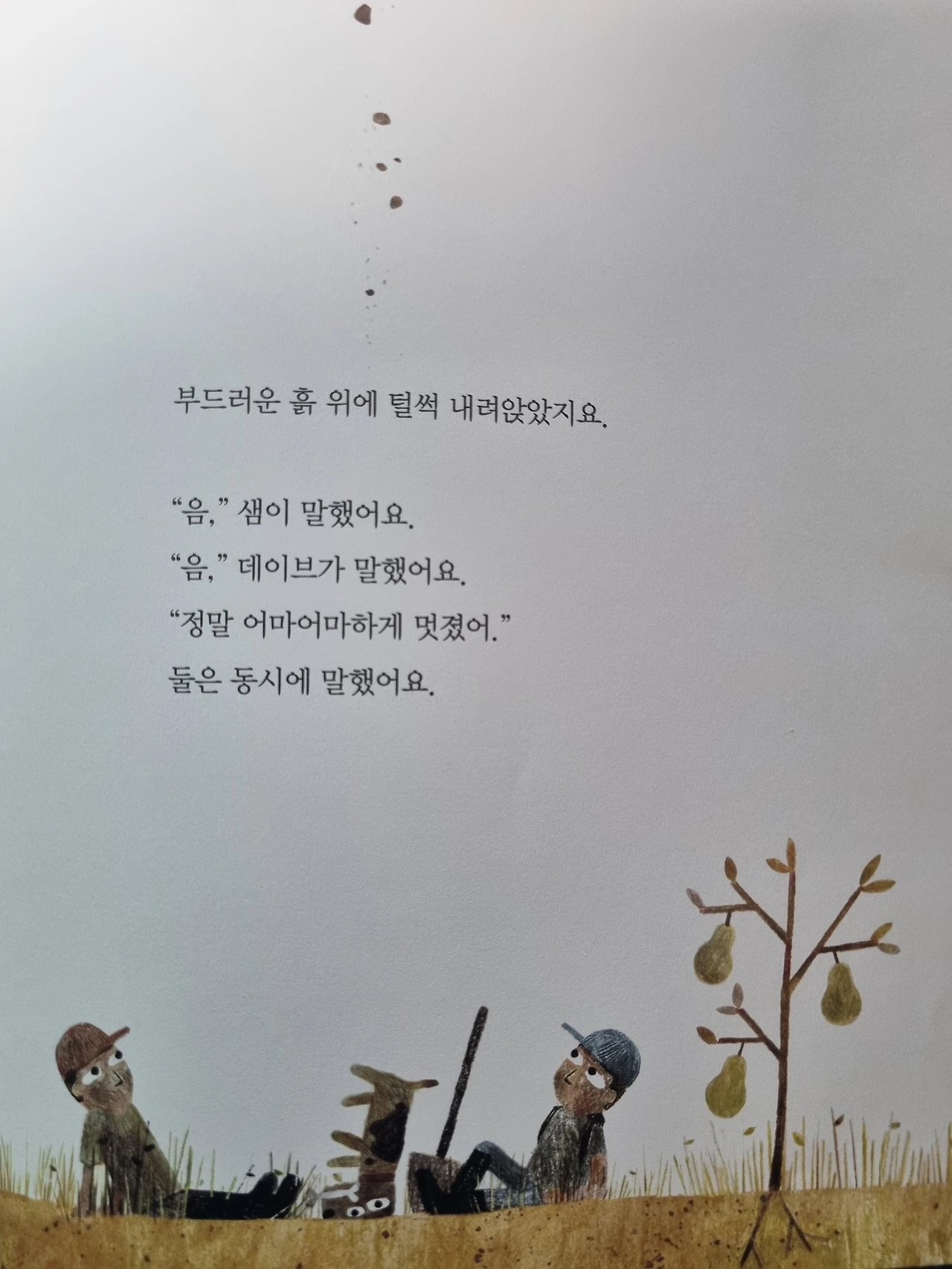 샘과 데이브가 삽질만 하다 끝난 하루를 “정말 어마어마하게 멋졌어.”라고 말하는 페이지 한 장에 나를 그려 넣었다. 하루에 진심을 담고, 긍정의 마음으로 세상을 바라보며 살아가다 보면 우연히 지나가던 행운도 내 발에 걸리거나, 손에 잡히는 날도 있을 거라 믿는다. 오늘도 그런 마음으로 하루를 채워본다.