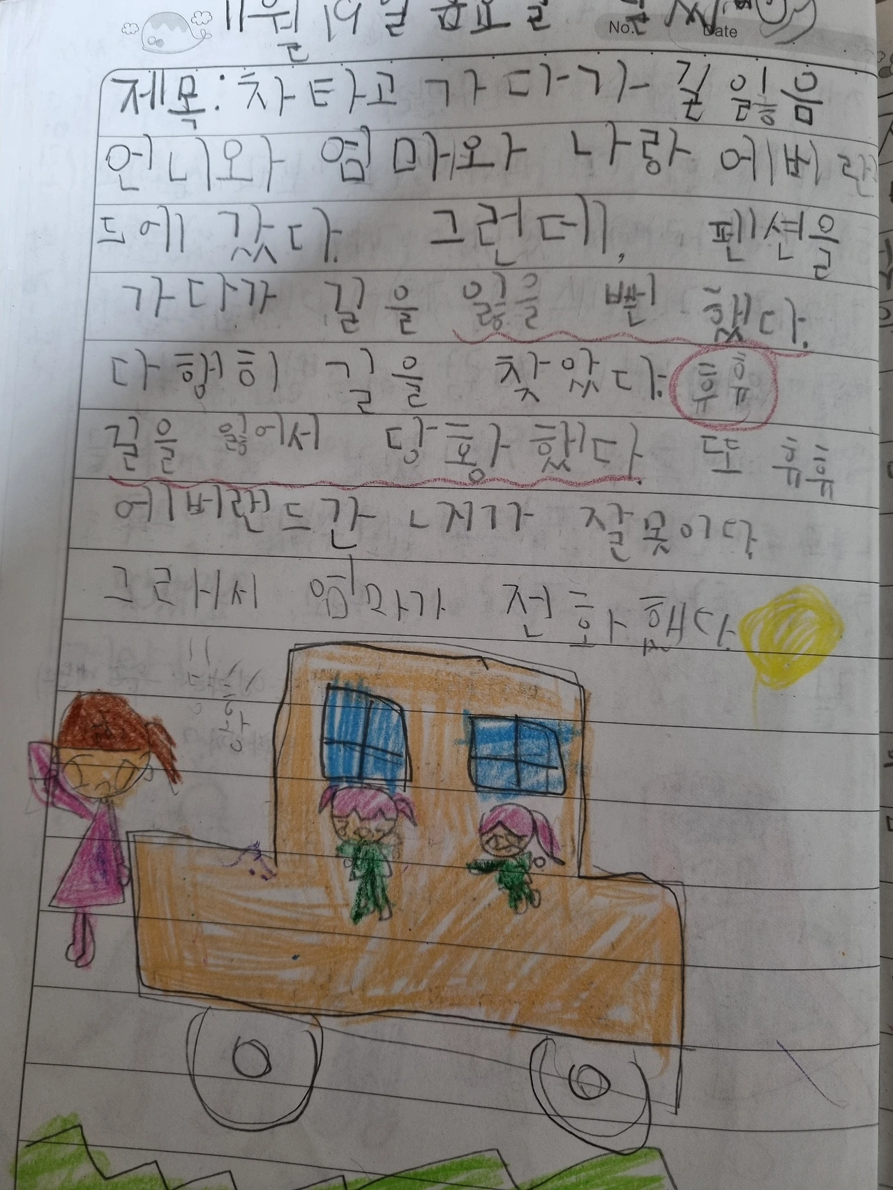 에버랜드 간 날 어둠에 펜션을 찾지 못한 엄마와 자신의 당황스러움을 써 내려간 이야기에는 그날의 상황이 살아있다.