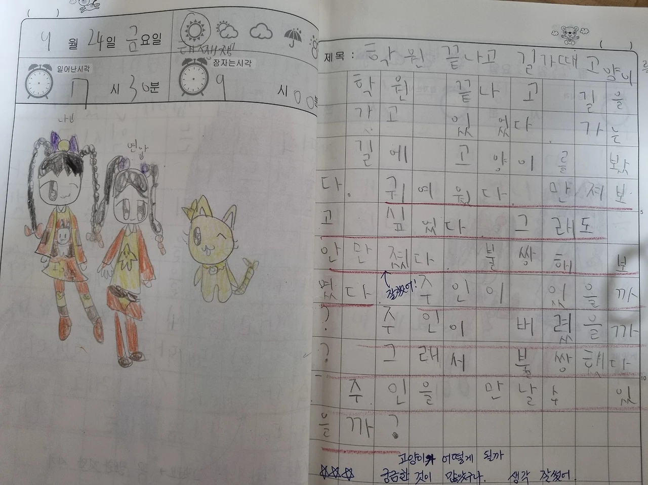 학원을 마치고 집에 돌아오다 길고양이를 보게 된 날 느낀 마음을 보고 아이와 길고양이의 모습이 사진처럼 그려지기도 했다.