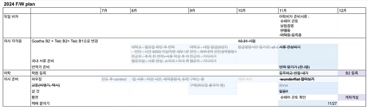 퇴사 날짜가 가시권으로 들어오자, 막연하게 생각하고 있던 출국 준비가 본격적으로 진행되었습니다. 해야 할 것들이 많은 데다가 계속 생겨나는 게 도저히 머릿속에서 정리가 되지 않아, 크게 세 분야로 나누어 준비하기로 했습니다.