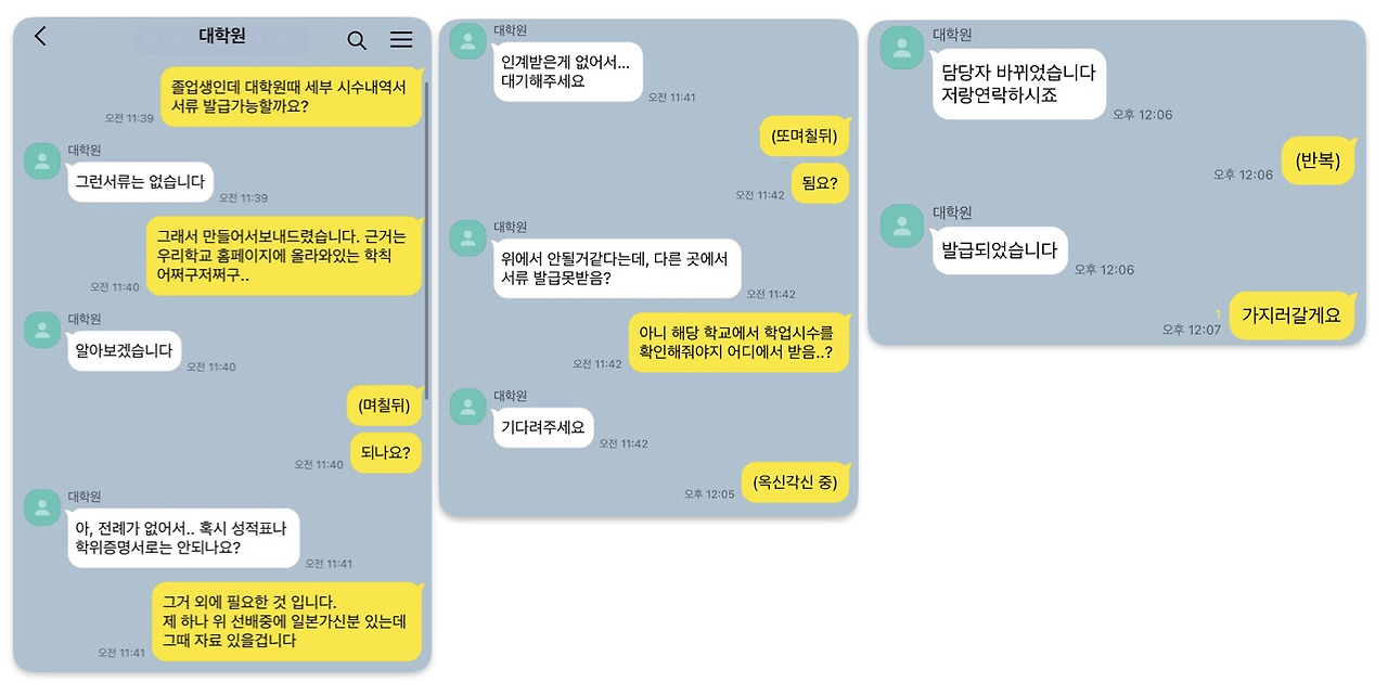 학과장님 면담이 가능한 갓 졸업한 학생이라면 오히려 빨랐을 텐데, 졸업한 지 거의 10년째인 저 같은 경우엔 학과 사무실을 통하는 방법뿐이 없었습니다. 종례에는 서류를 잘 인계받고 마무리 지을 수 있었지만, 매일 화요일 오전 전화해서 물어보는 게 서로에게 고역이었습니다.
