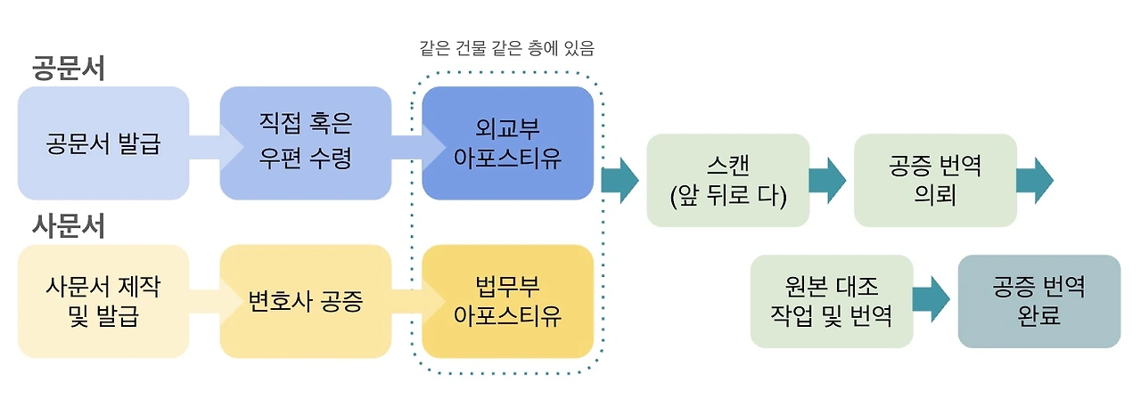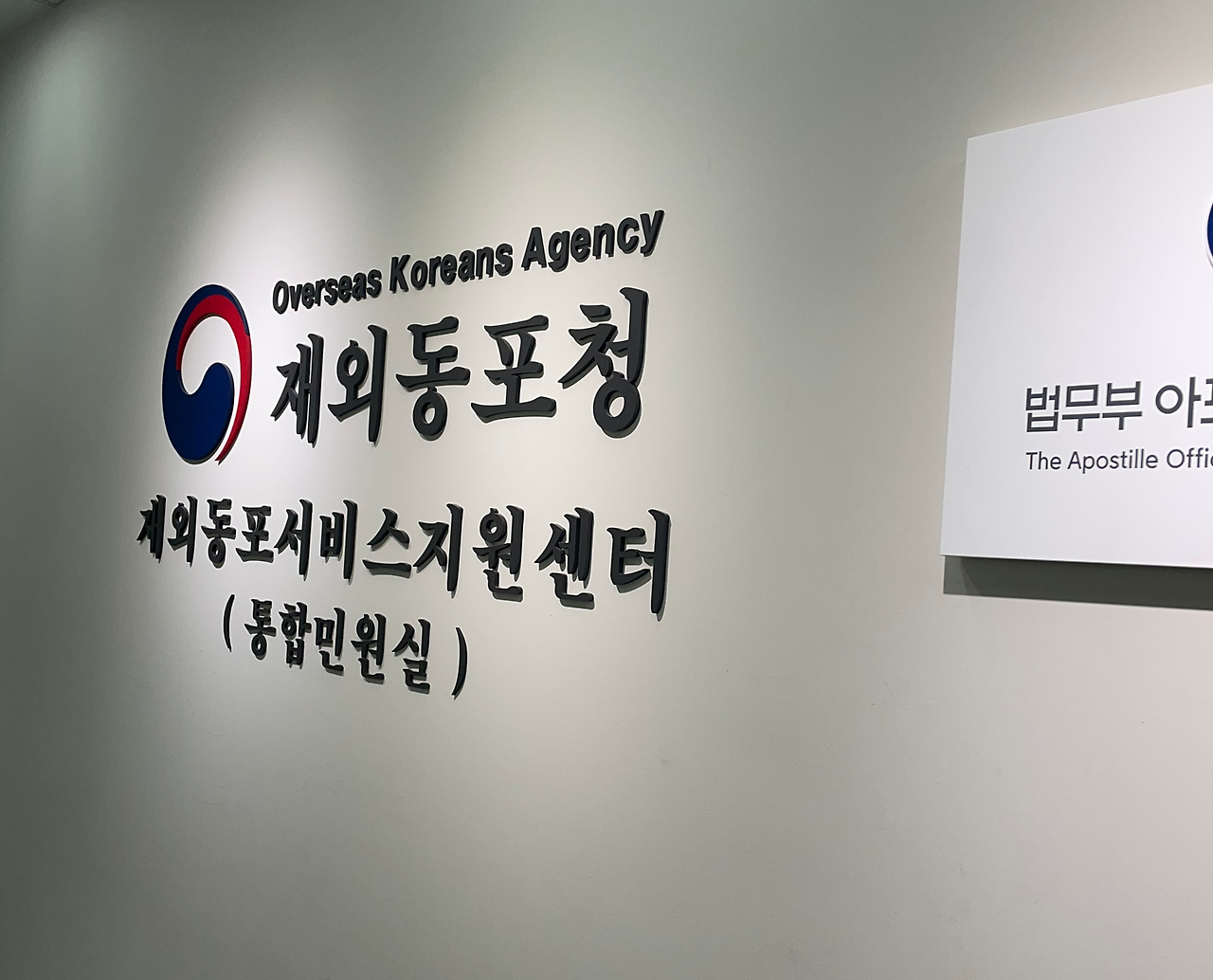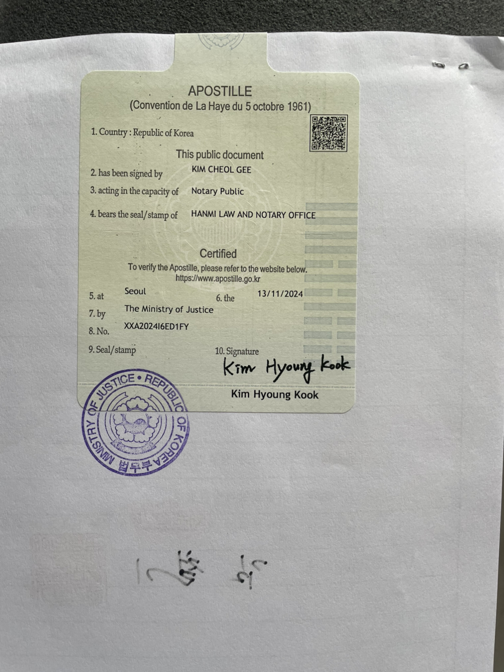근처의 공증 변호사무실에 가서, 사문서 공증을 받았습니다. 개당 3만 원 정도로, 맡긴 지 10-20분 안에 공증해 주셨습니다. 그다음, 재외동포청에 가서 아포스티유(오전에 가면 오후에, 오후에 가면 다음 날, 10개 이상의 서류는 다음날 발급받습니다. 여유 있게 가세요)를 발급받았습니다. 각 서류당 천 원씩이고, 현금 결제만 가능하니 현금가 져가세요.