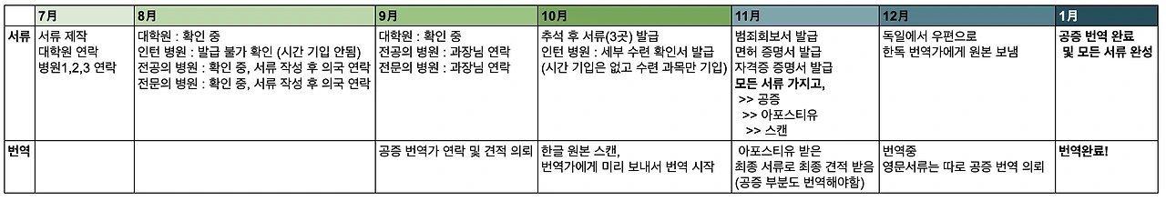 도합 19가지의 서류 중 공문서는 가족관계증명서, 기본증명서, 의사면허증, 전문의 자격증, 의사면허 증명서, 전문의자격증명서, 범죄경력회보서이고, 그 외는 모두 사문서입니다. 발급이 쉬운 공문서는 문제 될 게 없습니다. 정부 24와 동사무소에서는 하루 안에, 보건복지부는 1주일 안에 발급받을 수 있습니다. 까다롭다고 해봤자, 제출 시점으로 3개월 이내의 서류여야 하는 범죄회보경력서나 의사면허증명서 정도였는데, 출국 2주 전에 신청하여 출국 1주 전에 아포스티유받고 번역을 맞기느라 시간이 조금 빠듯한 것 외에는 없었습니다.