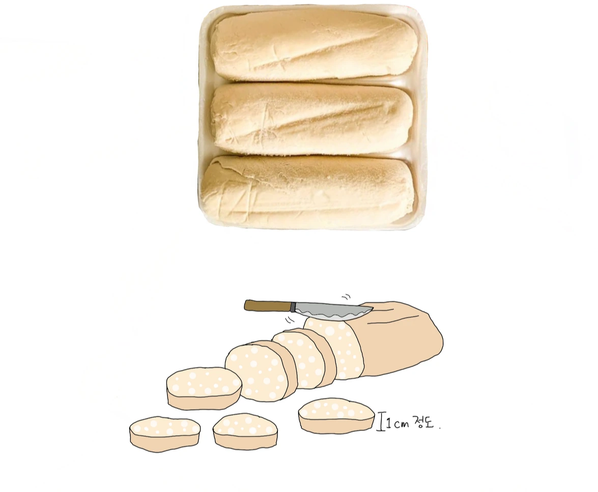 해동시킨 후 사용할 수 있다. 해동시킨 반죽을 1cm 안팎의 두께로 썰은 후 서로 달라붙지 않게