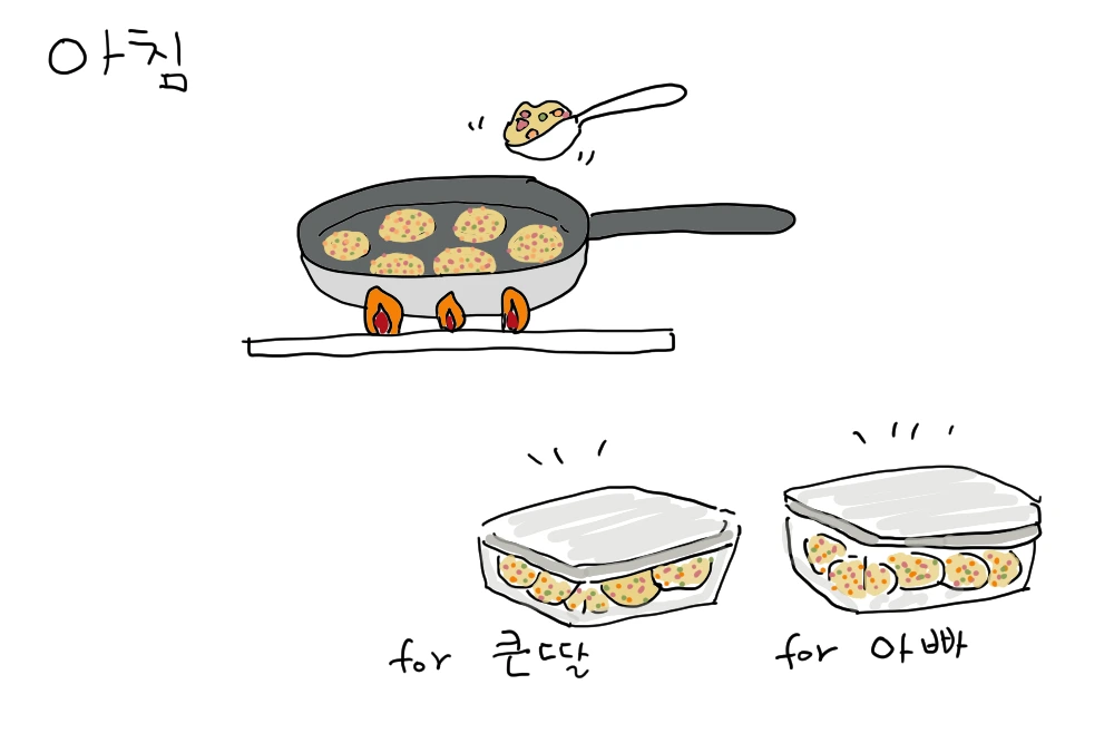 한입 사이즈로 작게 전을 만들어서 작은 컨테이너에 나누어 담아서 큰딸과 남편의 아침으로...