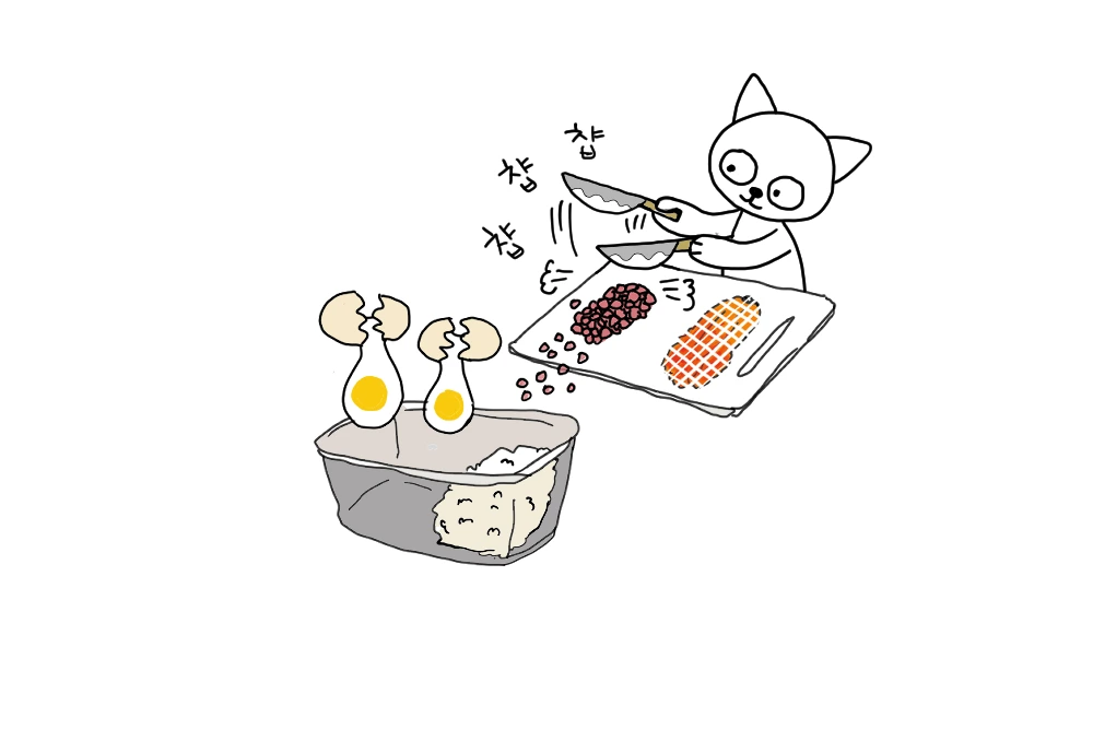 신김치도 잘게 다지고, 좀 애~매 하게 남은 반찬이 있다면 또 함께 다져서, 계란과 함께 모두 잘 섞는다.