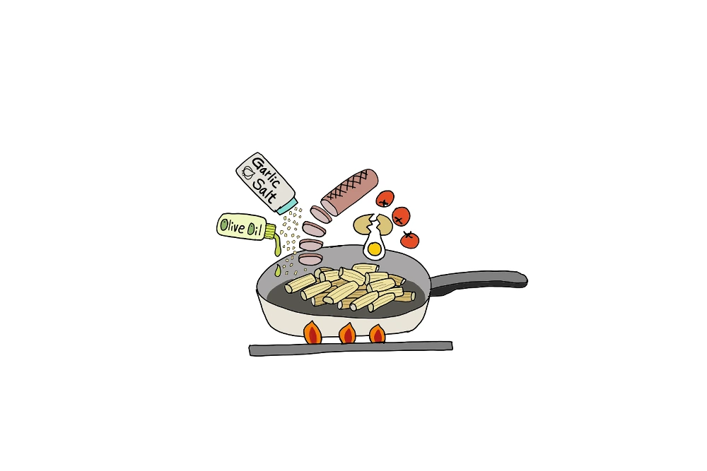 아침에 먹고 남은 소시지가 있고, 냉장고 안에는 며칠 전 먹고 남은 Rigatoni Pasta 가 조금 남아있다.