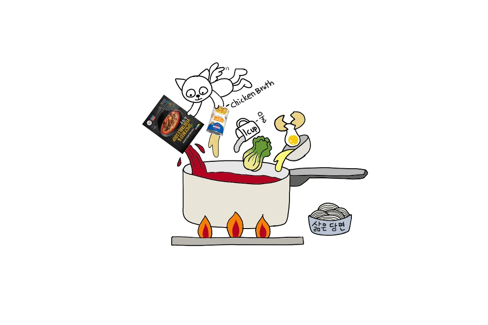 육개장 파우치 1개에 치킨 브로스 1캔과 물 1컵을 추가해서 끓이고 좋아하는 야채 (청경채, 숙주, 배추, 버섯...) 가 있으면 함께 끓인다. 계란은 그릇에 풀어서 마지막에 끓을 때 넣어주고, 잡채는 따로 삶아서 건져