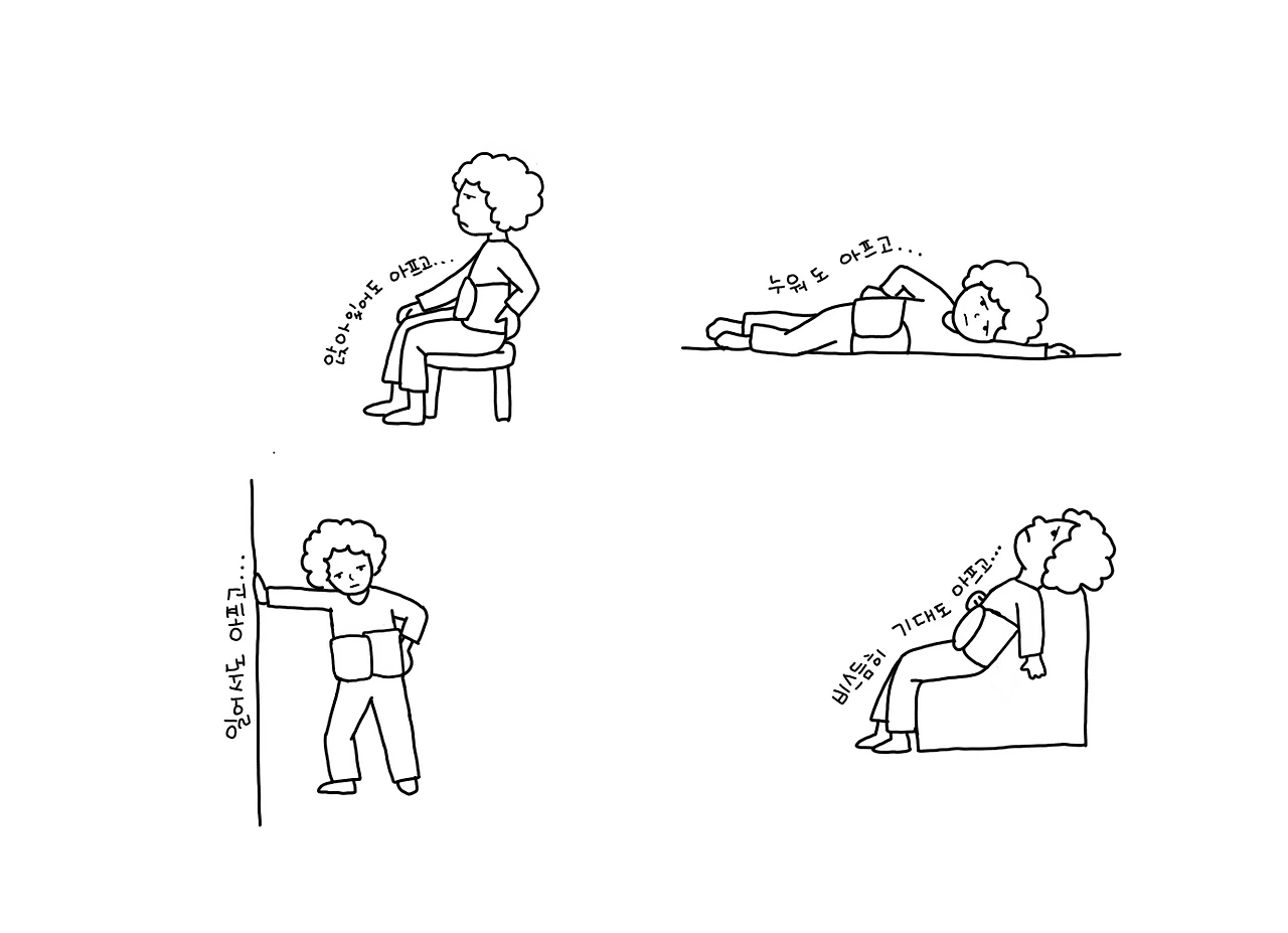 앉아있어도, 누워도, 어디에 기대고 앉아도 아프고 서있기도 힘들고 걷기도 힘들다.