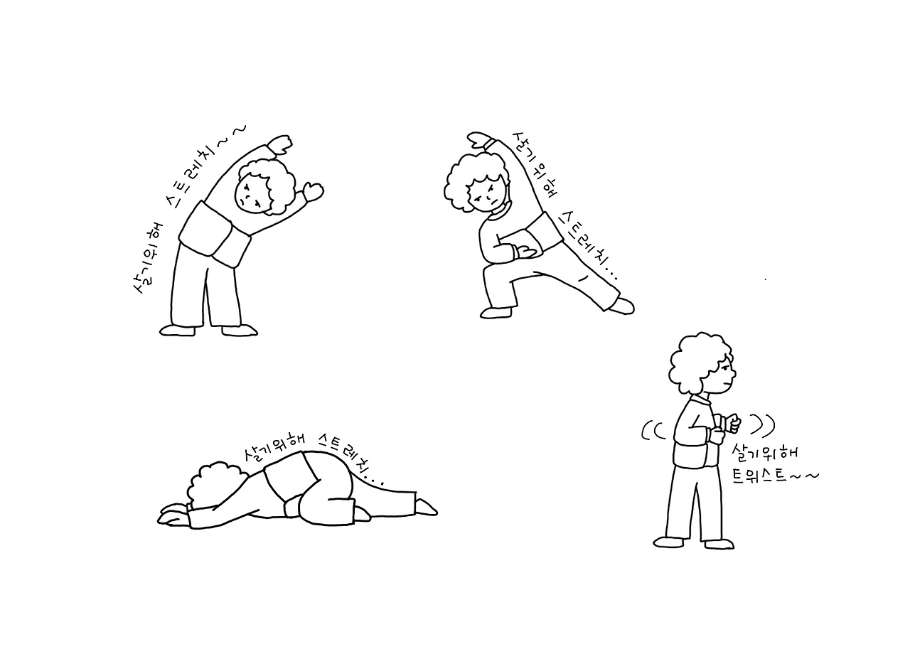 살기 위해 만세를 하고, 살기 위해 몸을 뒤틀고, 팔다리를 펼 수 있는 만큼 앞뒤 좌우로 늘려가며