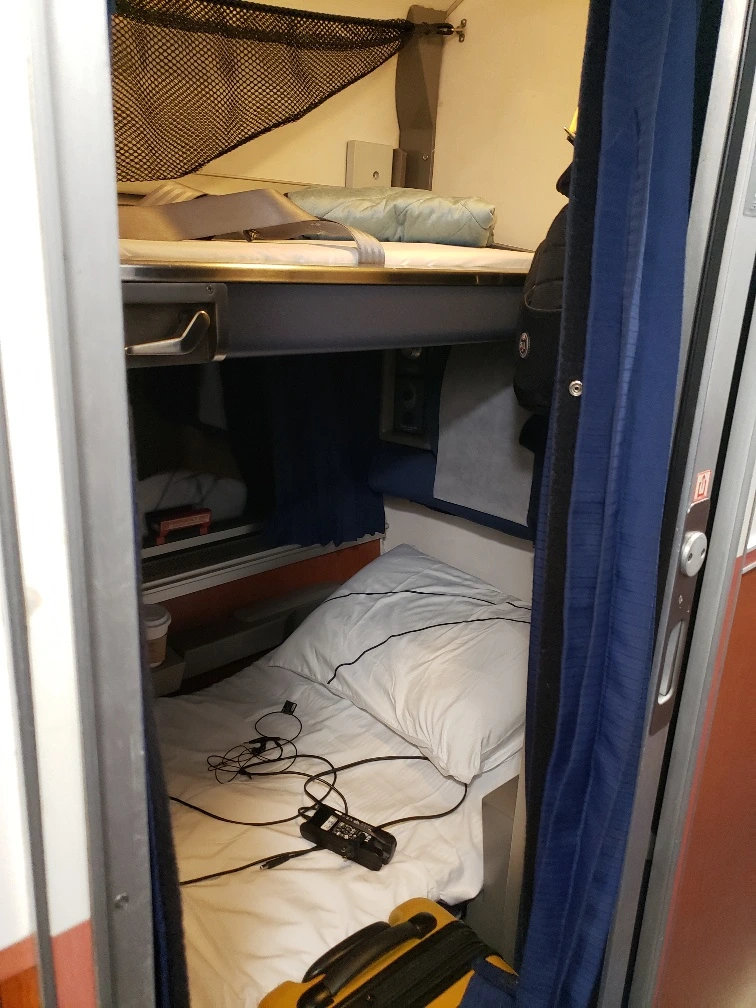 룸은 작지만 있을 건 다 있다 실내등과 에어컨 조절도 가능하고 전기 아웃렛도 있어서 전자기기 충전도 가능하다. 기차의 침대칸에서 잠을 자는 것에 대한 승객들의 리뷰는 크게 반반으로 나뉘었다, 기차의 소음과 계속 반복되는 진동이 숙면에 방해된다는 사람들과 오히려 도움이 된다는 사람들. 잠자리에 그다지 민감하지 않은