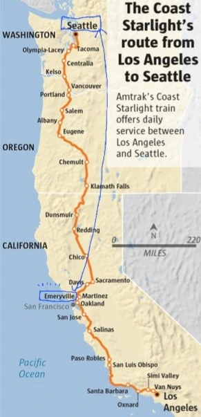 시애틀에서 캘리포니아 오클랜드까지 22시간을 달리면서 17개 정도의 역에 정차를 하고