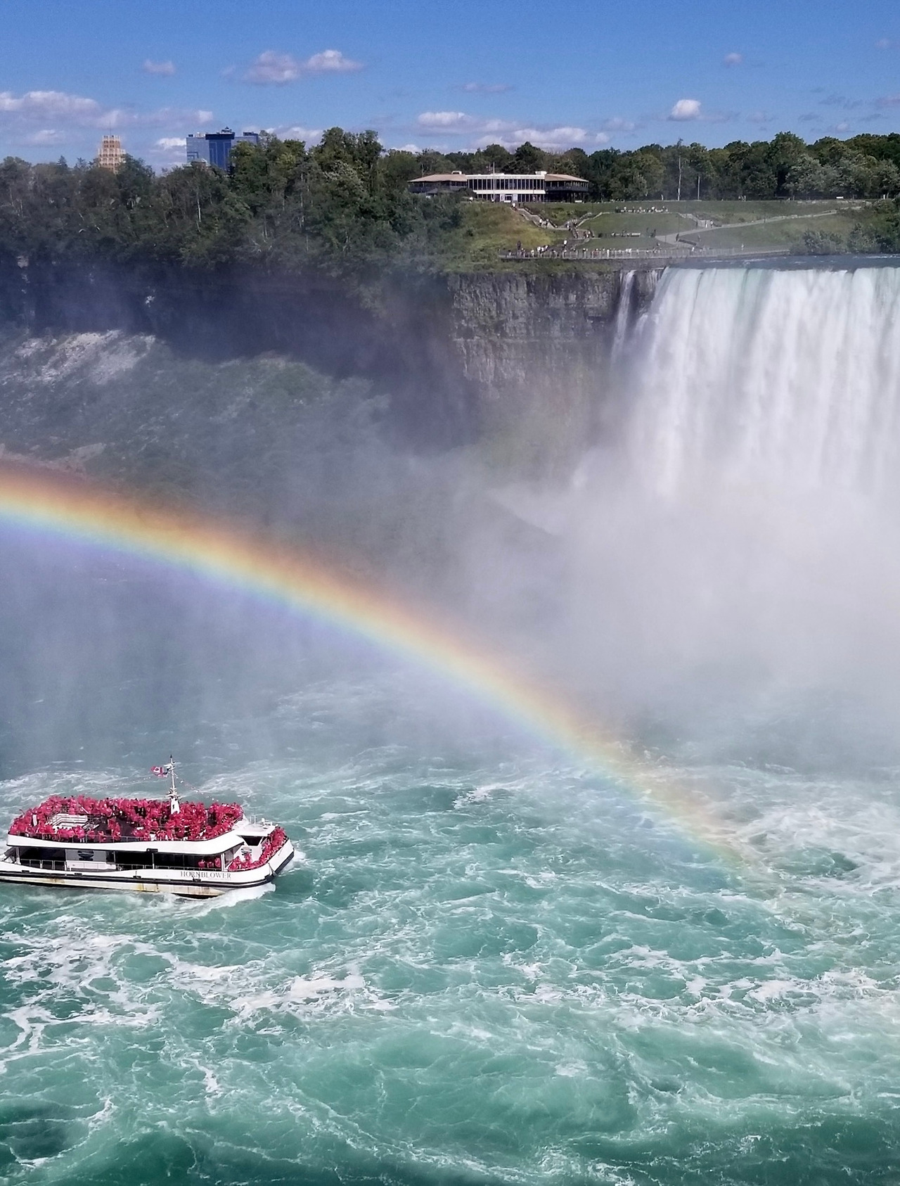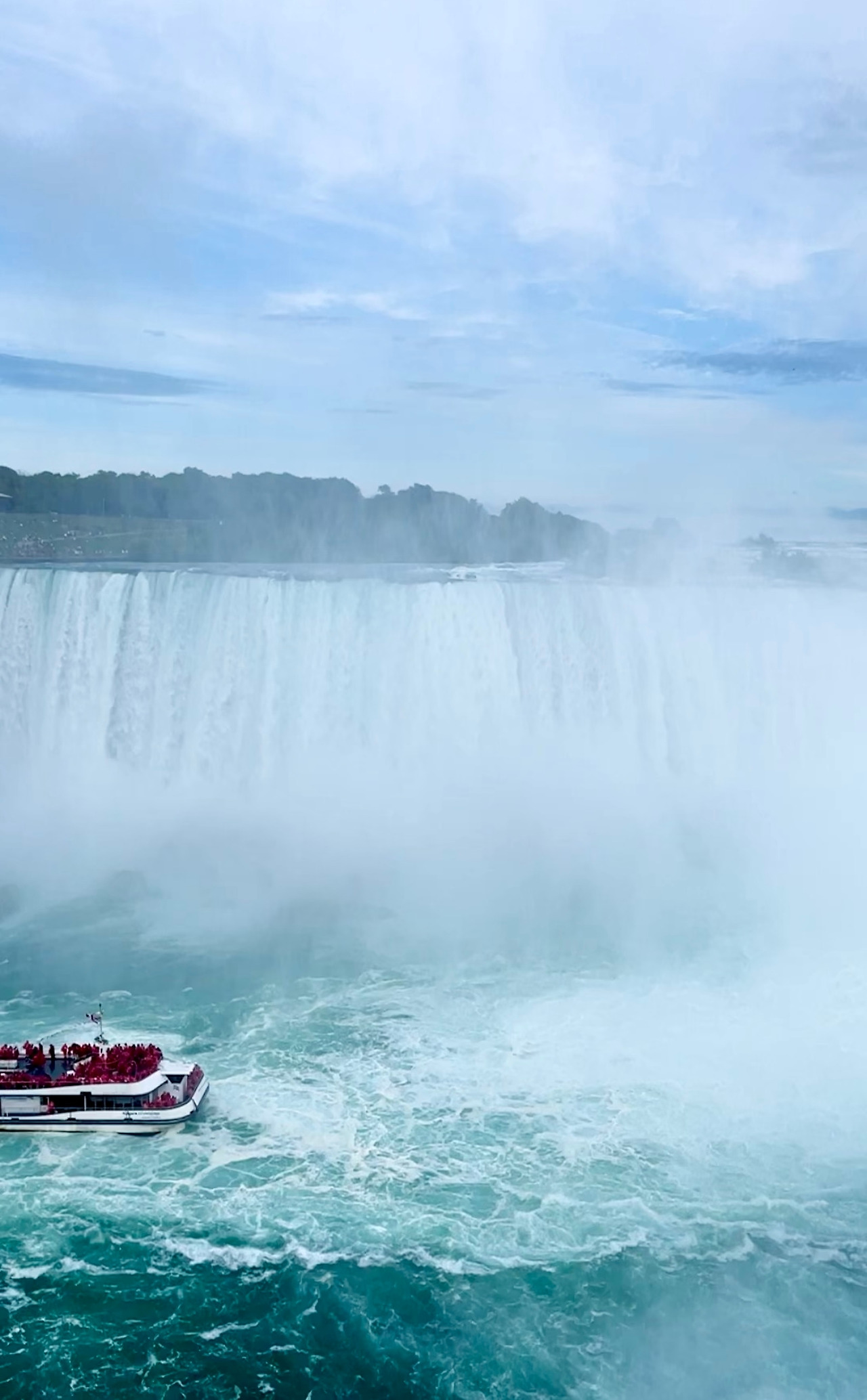 몇 해 전, 그냥 멀리서만 바라봐도 그 웅장할 거라고 생각만 했던 배를 타고 폭포 아래까지 가본 적이 있다. 배에 오르기 전 나눠주는 빨간 우비를 입었고(캐나다는 빨강을 반대편 미국은 파란색 우비를 입는다), 출발하는 배가 서서히 앞으로 나아갈 때 기대감과 동시에 긴장감이 몰려왔다. 흔들거리는 배 앞에서 떨어질까 봐 두려운 마음에 손에 힘을 쥐어 배를 꽉 쥐고 있었다. 배가 폭포 근처에 다다르자 '굉음'이라는 단어로는 부족한 웅장한 소리가 내 귀를 때렸고, 눈을 뜰 수 없을 만큼 수많은 물살이 만들어낸 물안개와 물방울이 하늘에 치솟아 배 위에 있는 우리를 흠뻑 젖게 만들었다. 한여름에 맞은 나이아가라 폭포의 물은 시원했고, 폭포아래로 갈수록 느끼는 그 짜릿함과 눈앞에서 쏟아져 내리는 폭포의 위엄을 아직도 잊을 수도 없다.