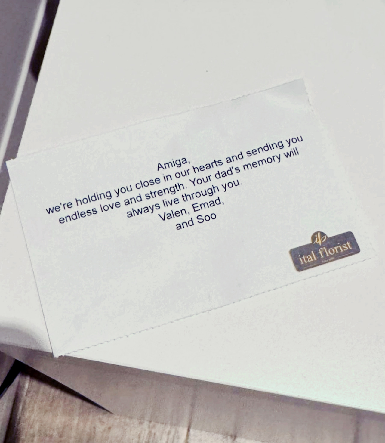 아버지의 장례를 마치고 돌아온 월요일, 그녀가 돌아왔을 때 우리는 어떤 말도 하지 못했다. 서로 껴안고 한없이 울었다. "정말 미안하다. 너의 슬픔을 뭐라고 위로해야 할지 모르겠어. 너와 너의 가족이 이 시간을 잘 이겨내길 기도할게."라는 말만이 전부였다.