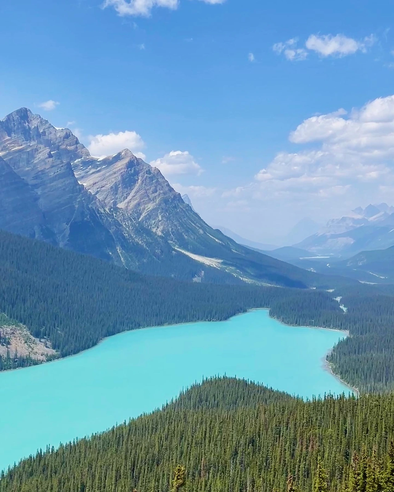 1. 페이토 호수 (Peyto Lake)였다. 전망대에서 내려다본 호수는 주변 페이토 빙하에서 흘러들어온 빙하암 가루 때문에 특히 밝고 눈부신 청록색을 띠는 것이 특징이고, 계절과 햇빛의 강도에 따라 색깔이 미묘하게 변한다고 했다.