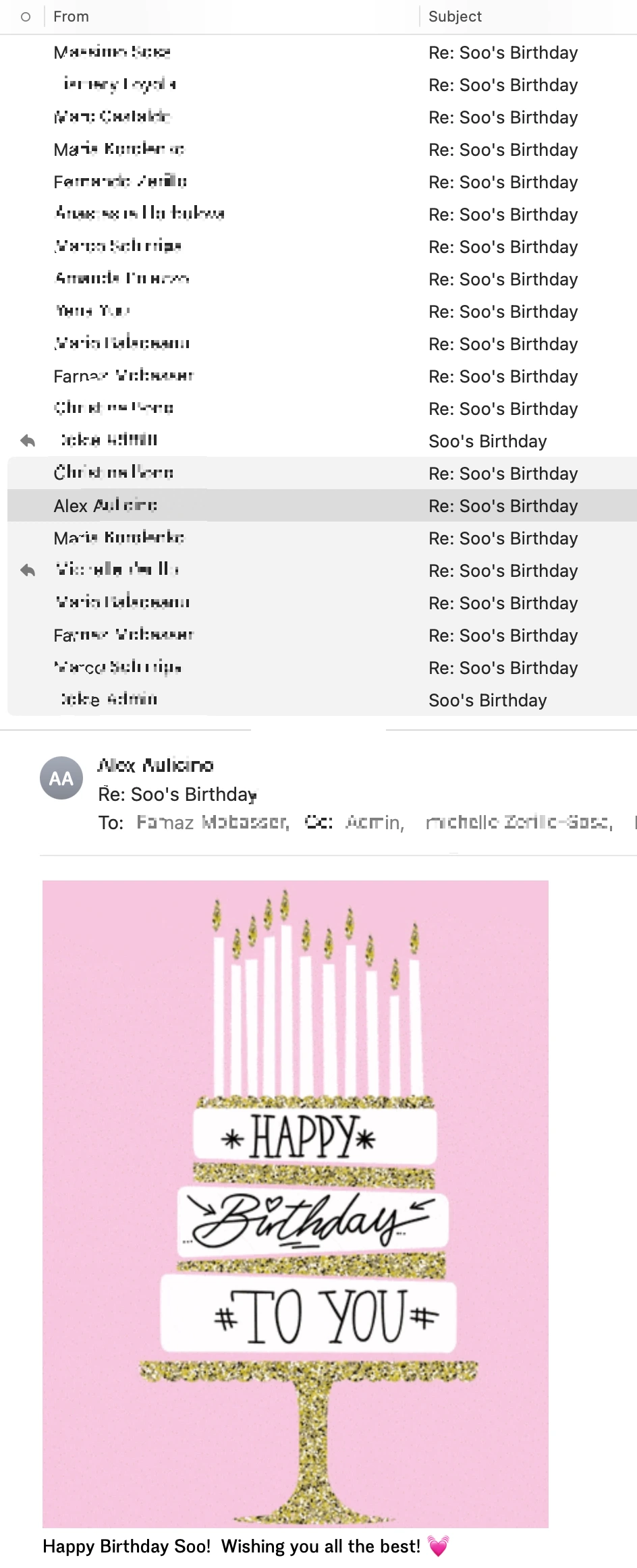 캐나다에서는 출근하자마자 이메일로 축하 메시지를 받는다. 아침에 축하를 받으면 하루 종일 좋은 분위기에서 일할 수 있다는 의미일지도 모른다. 반면, 한국에서는 바쁜 업무를 마친 후, 하루를 마무리하면서 다 함께 축하하는 분위기였다