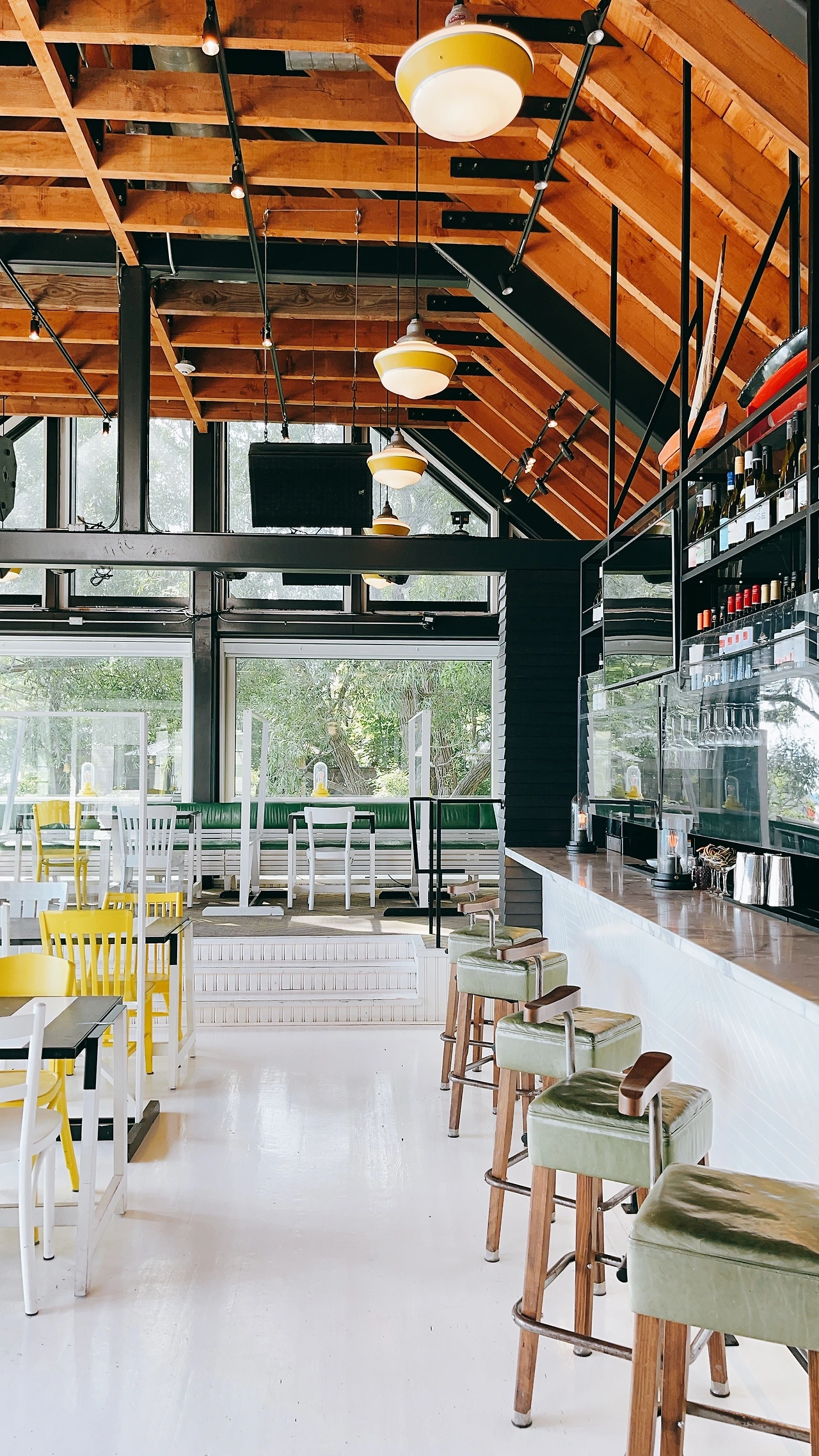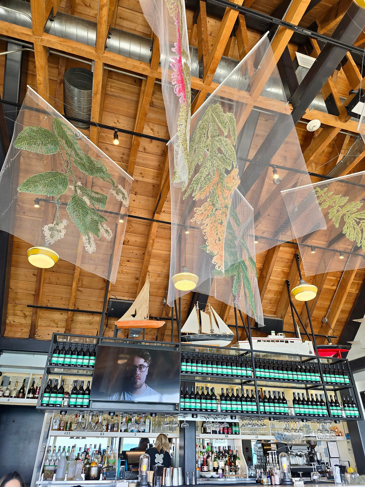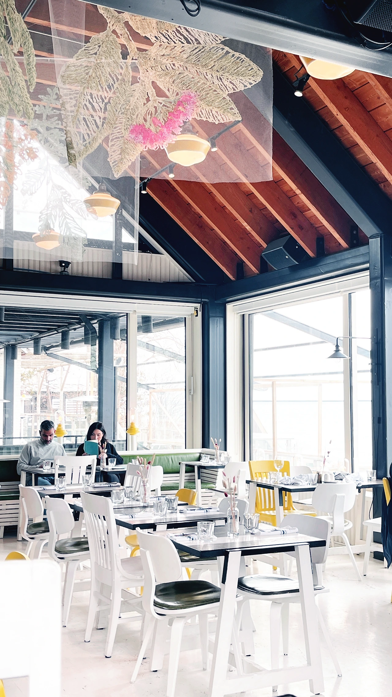 넓은 유리창 너머로 호숫가가 한눈에 펼쳐지는 레스토랑. 노란빛 테이블과 높은 천장이 주는 따뜻한 분위기 속에서, 내가 좋아하는 피시 앤 칩스, 색이 예쁜 샐러드, 그리고 시원한 샴페인 한 잔을 즐긴다.