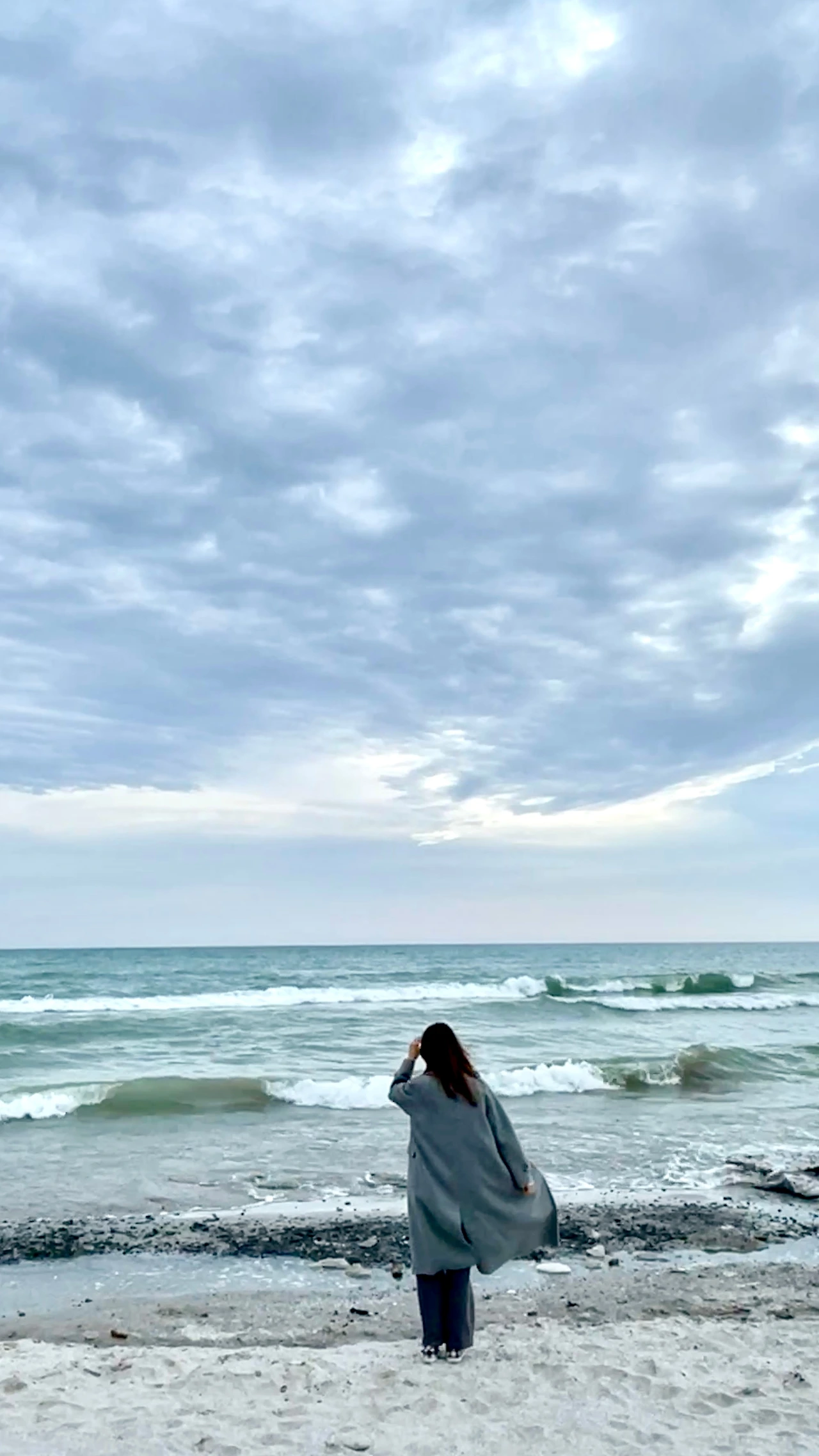 레스토랑 앞, 끝이 보이지 않는 수평선 너머로 호수의 물결이 바람에 따라 출렁이고, 내 머리카락도 바람을 타고 흩날렸다.